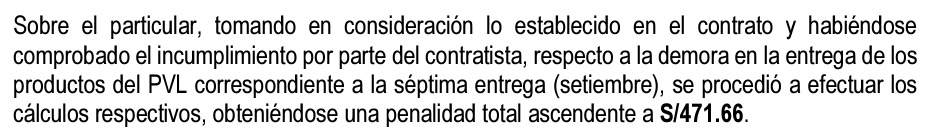 Cabe precisar, que el citado municipio ante el injustificado retraso del contratista en entregar los alimentos del PVL debería aplicar penalidades diarias por mora en la entrega de alimentos del PVL.