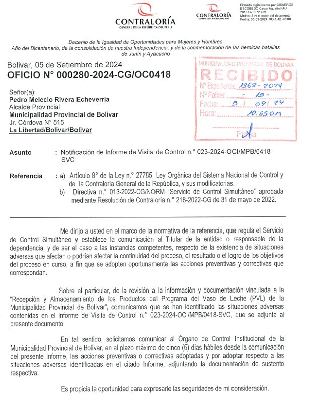 Lo mencionado en esta nota periodística, se basa en el Informe de Visita de Control N° 023-2024-OCI/MPB/0418-SVC, el mismo que ha sido puesto en conocimiento del alcalde Melecio Rivera Echeverría, para que adopte las acciones preventivas y correctivas que correspondan.