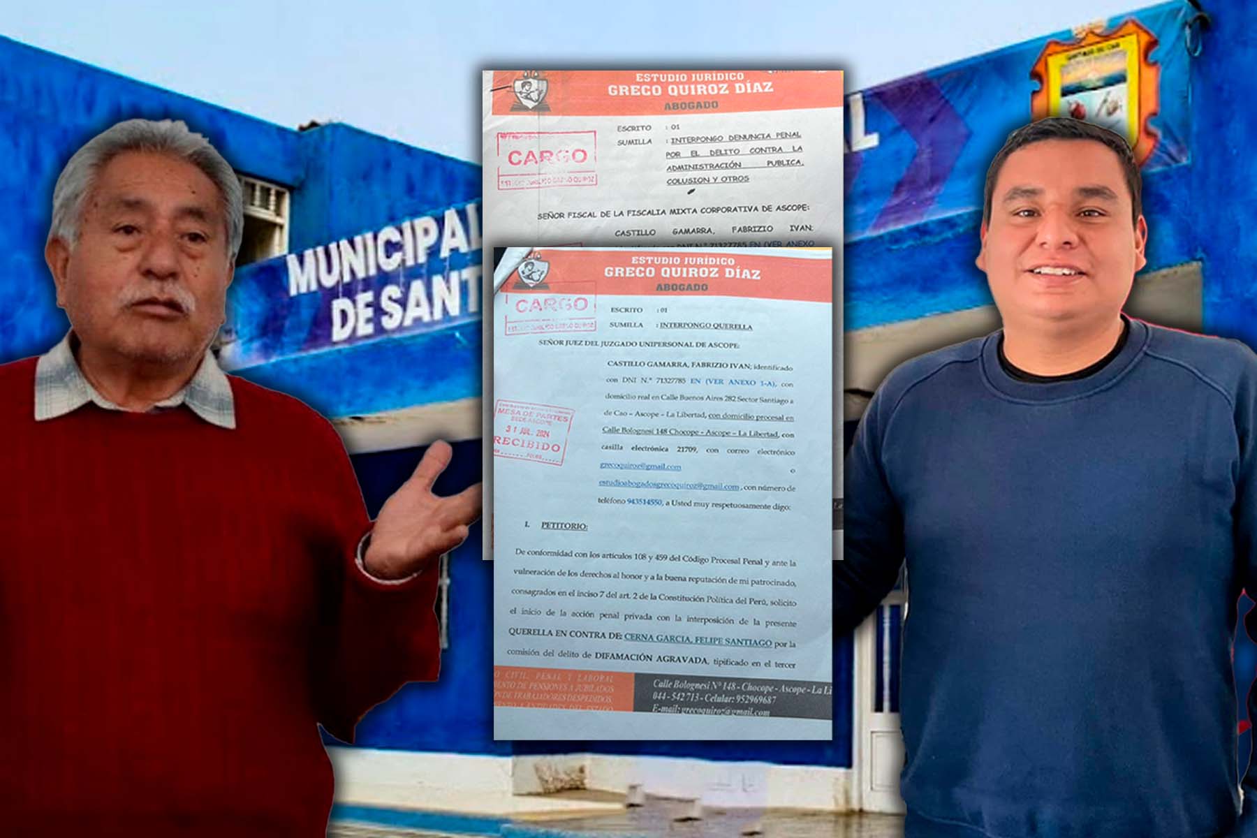 El primer regidor de la Municipalidad Distrital de Santiago de Cao, Fabrizio Castillo Gamarra, presentó 2 denuncias penales contra el alcalde de la citada comuna, Felipe Cerna García, por la presunta comisión del delito de colusión y por difamación agravada, ante la Fiscalía Mixta de Corporativa de Ascope y el Juzgado Unipersonal de Ascope, respectivamente.