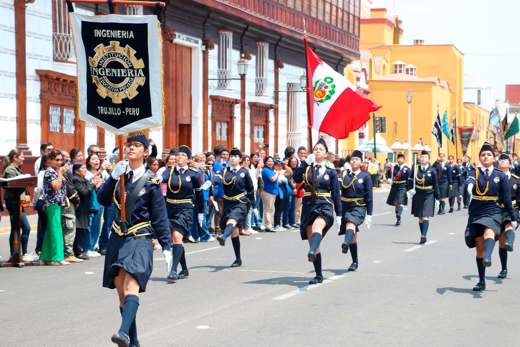 Con motivo de la celebración de su 33° aniversario, el Colegio Ingeniería llevó a cabo un destacado Concurso de Escoltas en la Plaza de Armas de Trujillo, donde más de 20 escoltas de diferentes colegios de la región desfilaron con gallardía y disciplina frente a un estrado oficial conformado por autoridades cívico-militares.