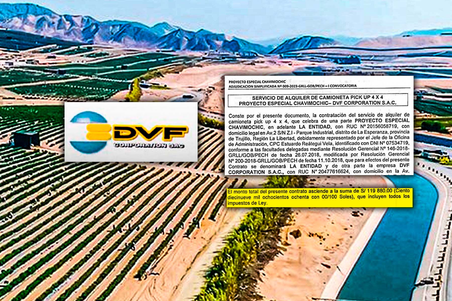 El pasado 30 de octubre de 2023, el Proyecto Especial Chavimochic (PECH) firmó contrato con la empresa DVF Corporation SAC para el alquiler de una camioneta pick 4×4, por un monto de S/ 119,880. Según detalla el contrato, el plazo de la prestación del servicio era por un período de 300 días efectivos de trabajo.