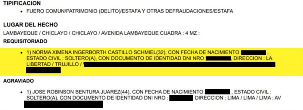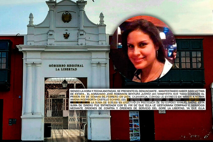 Macronorte accedió a una denuncia policial interpuesta, el pasado miércoles 9 de octubre del presente año, por José Robinson Bentura Juárez contra la actual subgerente de Logística y Servicios Generales de la Gerencia Regional de Administración del Gobierno Regional de La Libertad (GRLL), Norma Ximena Castillo Schmiel, por el presunto delito de estafa, los detalles de esta acusación son escandalosos.