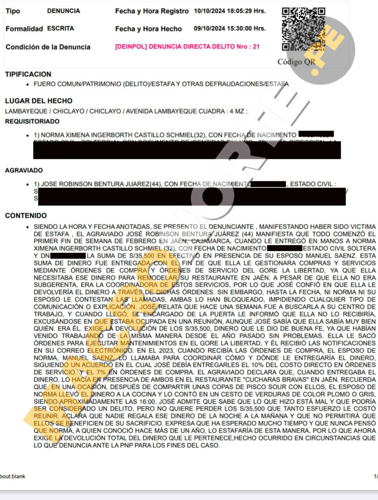 «Todo comenzó el primer fin de semana de febrero en Jaén, Cajamarca, cuando le entrego en manos a Norma Ximena Castillo Schmiel…, la suma de S/ 35,500 en efectivo en presencia de su esposo Manuel Sáenz. Esta suma de dinero fue entregada con el fin de que ella le gestionara compras y servicios mediante órdenes de compra y órdenes de servicio del GORE La Libertad, ya que ella necesitaba dinero para remodelar su restaurante en Jaen», indica la denuncia.