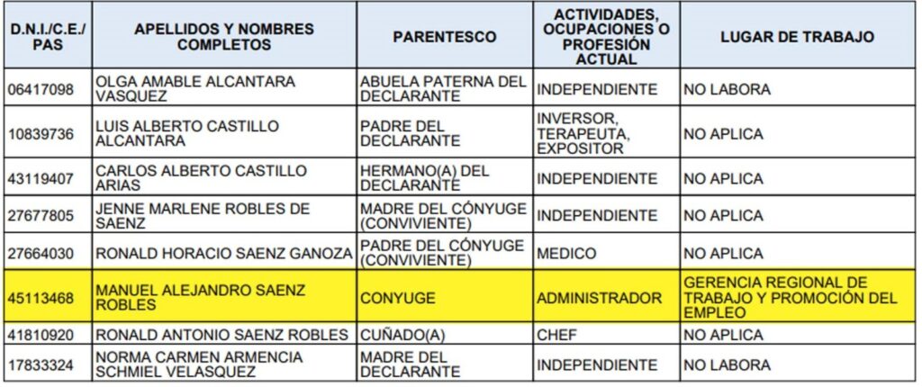 Respecto a la DJI de Norma Castillo, presentada en el año 2021, cuando estaba en el cargo de apoyo en cotizaciones, se visualiza que su esposo Saenz Robles se encontraba laborando en la Gerencia Regional de Trabajo y Promoción del Empleo del Gore La Libertad.