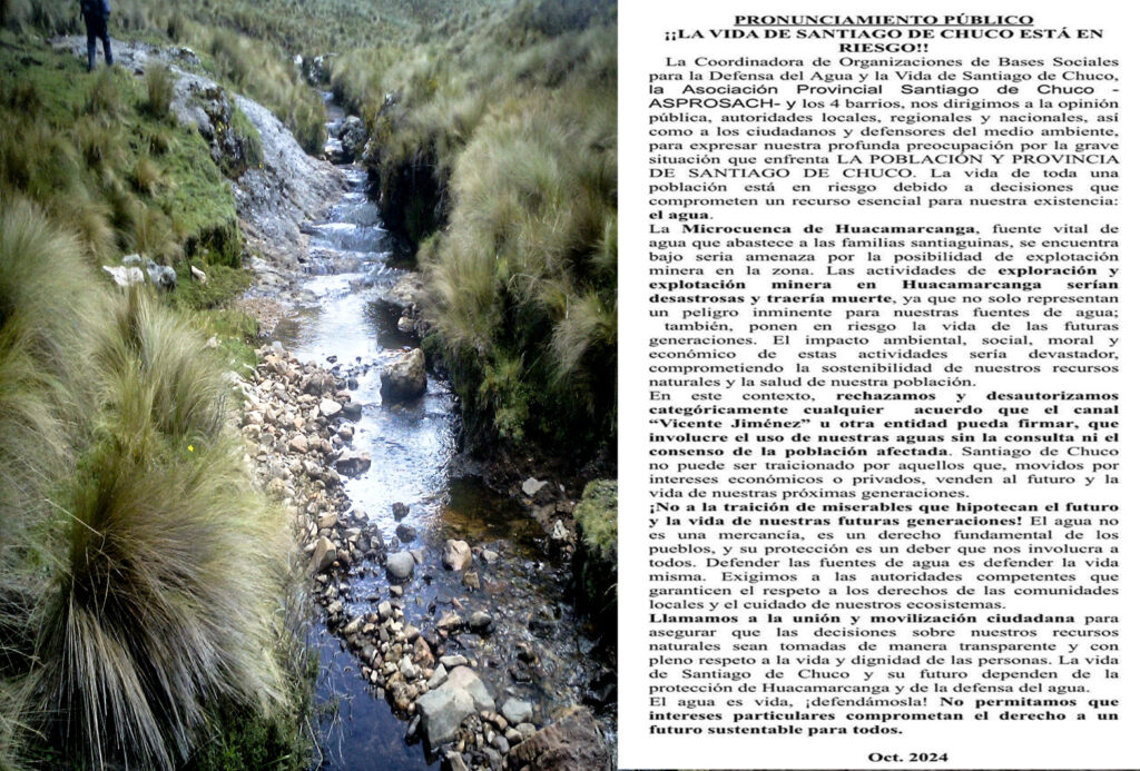 El agua no se negocia, el agua se defiende. La Coordinadora de Organizaciones de Bases Sociales en Defensa del Agua y la Vida de Santiago de Chuco se pronunció sobre el proyecto minero La Colorada, que se trataría de realizar en el caserío de Huacamarcanga, distrito de Usquil.