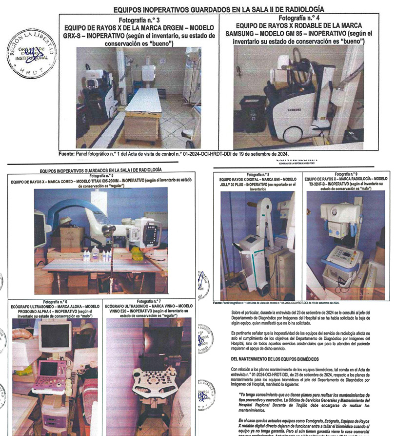 En el Departamento de Diagnóstico por Imágenes cuenta con nueve equipos biomédicos, de los cuales 7 se encuentran inoperativos en las salas I y II de Radiología, mientras que un tomógrafo y un ecógrafo solamente brindan el servicio de diagnóstico por imágenes.