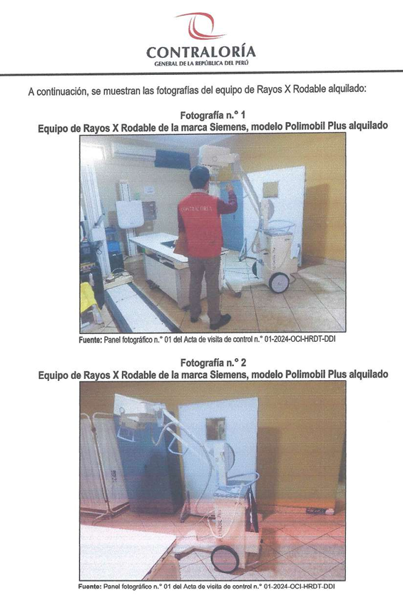 Ante la falta de equipos de Rayos X, este nosocomio viene alquilando un equipo para brindar los servicios en el área de emergencia y hospitalización del HRDT, sin embargo, su uso no es suficiente para cubrir la alta demanda de estos servicios (diagnóstico por imágenes).