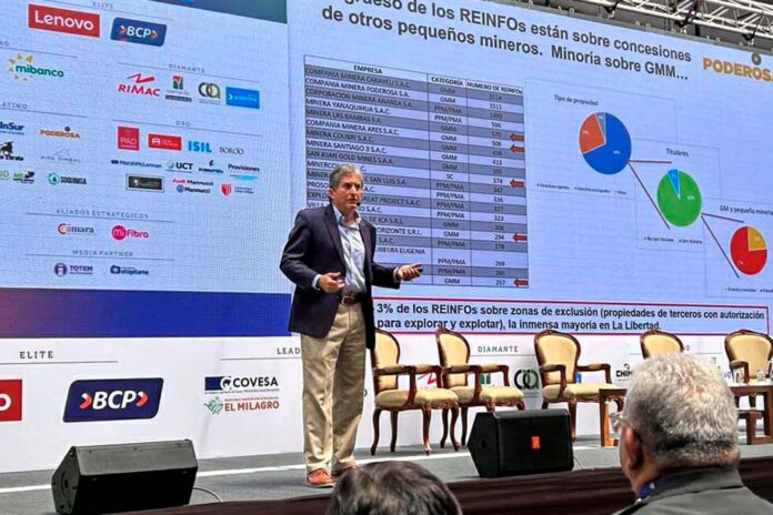 En el marco del XXXV Encuentro Empresarial del Norte (EEN), organizado por la Cámara de Comercio de La Libertad, Pablo de la Flor, gerente de Asuntos Corporativos de Minera Poderosa, analizó el creciente problema de la minería ilegal, señalando como una de las principales causas la ineficacia del Registro Integral de Formalización Minera (REINFO).