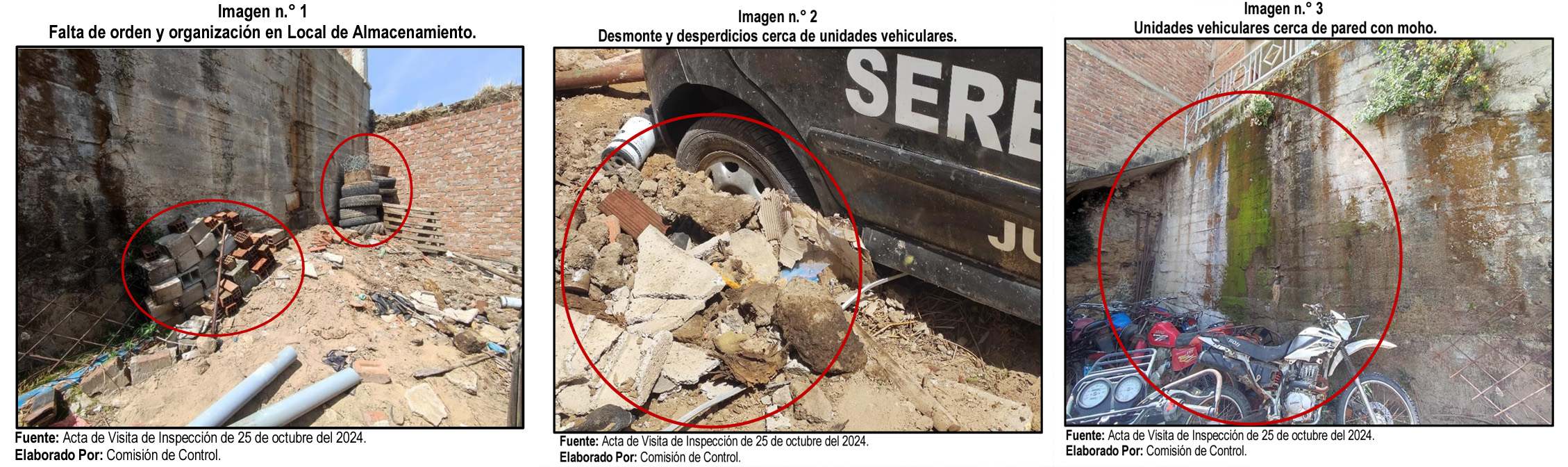En dicho local, se evidenció la presencia de desmonte, desperdicios cerca de las unidades móviles, neumáticos en mal estado, paredes con presencia de moho, entre otros; dificultando el uso del espacio en su totalidad y poniendo en riesgo el resguardo apropiado del transporte municipal.