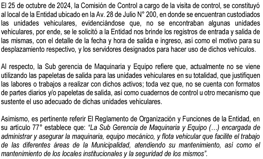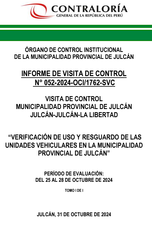 Finalmente, la Contraloría General de la República, en su Informe de Visita de Control N° 052-2024-OCI/1762-SVC, precisa que las unidades móviles de este municipio se usan sin realizar el registro de movimiento patrimonial, a fin que se justifique que labores realizan.