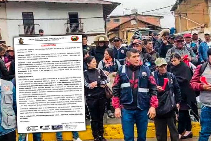 La Central Única Provincial de Rondas Campesinas de Sánchez Carrión anunció que acatarán un paro de 24 horas el viernes 15 de noviembre.