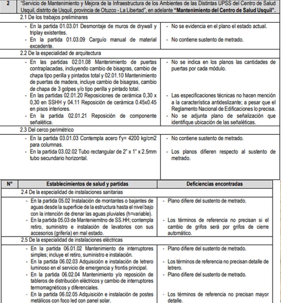 Esto, evidenciaría que “no se cuenta con descripción precisa para cumplir con la correcta ejecución de las precitadas partidas que conforman los servicios de mantenimiento de dichos establecimientos de salud”.