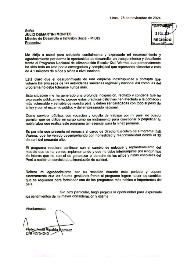 En su carta, Ripalda también precisó que presentó su renuncia ante el ministro de Desarrollo e Inclusión Social debido a que no puede permitir que se use su cargo como instrumento para cuestionar la labor que realiza Qali Warma para los niños de bajos recursos.