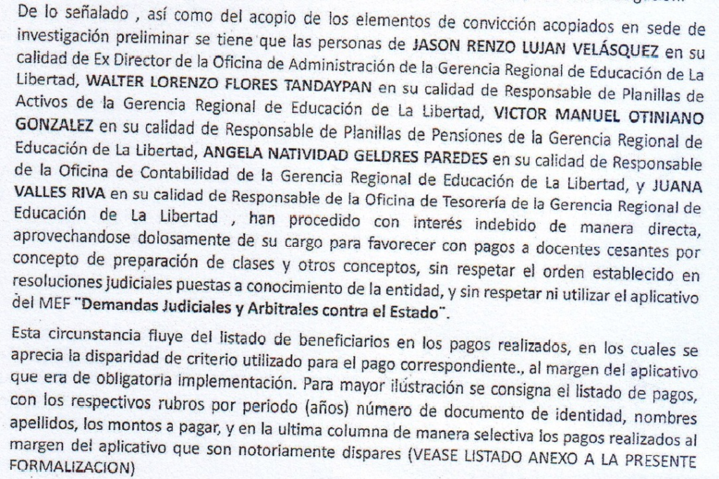 Macronorte.pe accedió a la Carpeta Fiscal N° 290-2018 (investigación preparatoria), que pone de conocimiento que existiría una presunta mafia enquistada en el área de Planillas de la GRLL y que integraría Flores Tandaypan, dedicada al pago irregular a docentes cesantes por el concepto de deudas acumuladas por preparación de clases.