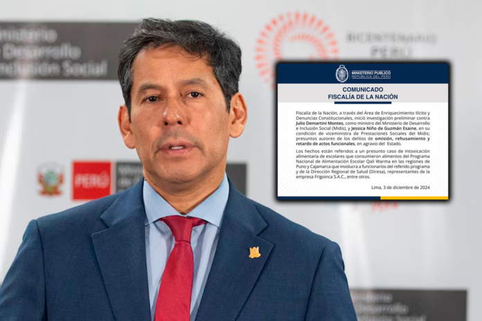 La Fiscalía de la Nación anunció el inicio de las investigaciones contra el ministro de Desarrollo e Inclusión Social (Midis), Julio Demartini, y la viceministra de prestaciones sociales del Midis, Jessica Niño de Guzmán, por los presuntos delitos de omisión, rehusamiento y retardo de funciones.