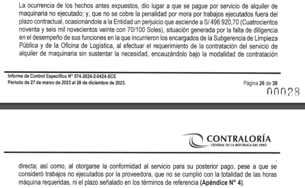 La CGR también precisa que no se regularizó la documentación correspondiente que sustente la contratación directa del servicio mencionado. Asimismo, los trabajos de limpieza no se ejecutaron en su totalidad, se contravino el plazo establecido y se realizaron en zonas que no correspondían ser atendidas al no encontrarse comprendidas en los territorios vecinales objeto de la contratación por emergencia.