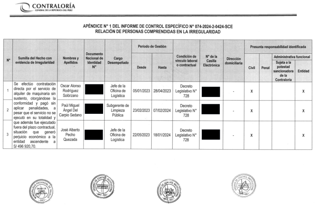 Tras los hechos mencionados, la Contraloría halló presunta responsabilidad civil y administrativa para los siguientes exfuncionarios del Segat: Óscar Rodríguez Solórzano, exjefe de Logística; Paúl del Carpio Cedano, exsubgerente de Limpieza y José Pecho Quezada, exjefe de Logística.