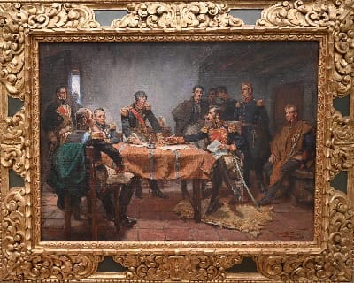 4. Capitulación de Ayacucho (Pintura): Realizada por Daniel Hernández en 1924 como parte de las celebraciones por el centenario de la independencia, esta pintura retrata la firma de la capitulación en un escenario interior lleno de detalles históricos. Se encuentra en el Museo del Banco Central de Reserva del Perú, ubicado en Jr. Ucayali esquina con Jr. Lampa, Cercado de Lima. La atención es de martes a domingo, de 9:00 a. m. a 5:00 p. m.