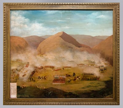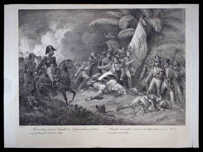 3. Memorable y decisiva Batalla de Ayacucho (Grabado): La litografía de Denis Auguste Raffet, creada en 1826, presenta una visión artística de las tropas de Bolívar enfrentándose al ejército realista, con inscripciones en español y francés. Este grabado forma parte de la colección del Museo de Arte de Lima, ubicado en Paseo Colón N.° 125, Cercado de Lima. La atención es de martes a domingo, de 10:00 a. m. a 8:00 p. m., sábado hasta las 5:00 p. m.