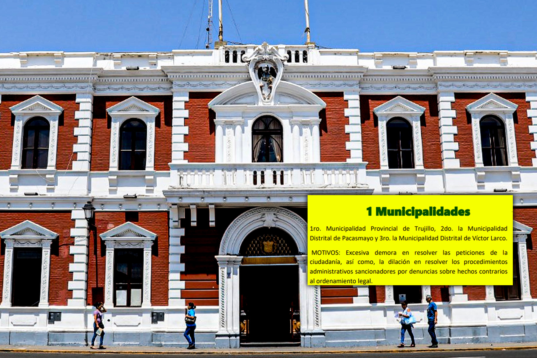En lo que corresponde a los municipios más quejados, lo encabeza la Municipalidad Provincial de Trujillo (MPT), liderara por el alcalde Mario Reyna.