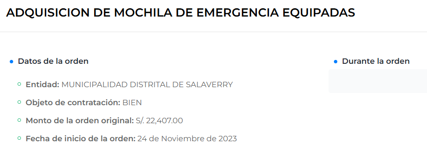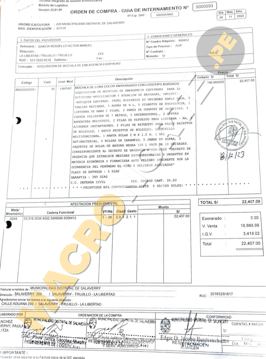 El pasado 24 de noviembre de 2023, la Municipalidad Distrital de Salaverry, bajo la dirección del alcalde Carlos Arroyo Rojas, adquirió 30 mochilas de emergencia por un costo total de S/22 407.