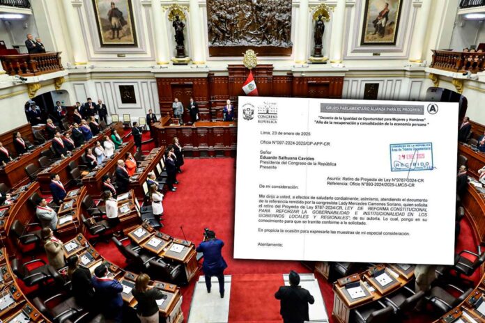 La congresista Lady Camones, de la bancada de Alianza Para el Progreso (APP), solicitó que se retire el proyecto de Ley N° 9787/2024-CR que proponía la reelección alcaldes y gobernadores regionales por un periodo adicional.