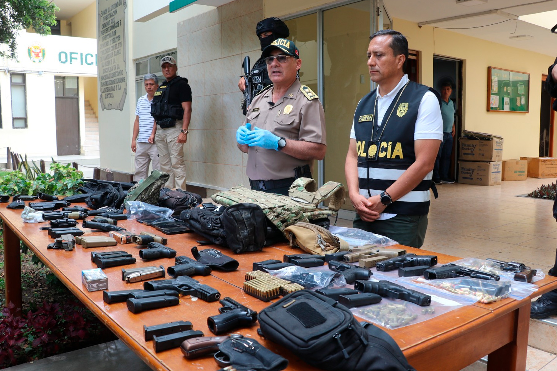 “Esta intervención es gracias a las nuevas estrategias de trabajo, como son las operaciones focalizadas en base a blancos objetivos. Todas estas personas refieren que se iban a trabajar o a visitar a sus familiares, pero qué clase de persona se va con todo este arsenal, con chalecos con placas para retener proyectiles de guerra. Se va a coordinar con Sucamec para que actúen de acuerdo a sus funciones”, sostuvo el general PNP Guillermo Llerena Portal, jefe de la Región Policial La Libertad.