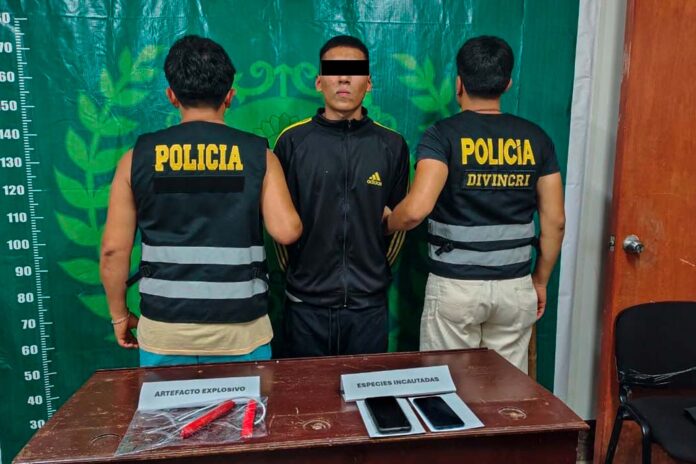 Según información policial, el individuo que pertenecería a la banda criminal “Los primos”, se encontraba desplazando en un vehículo por Alto Trujillo y al momento de intervenirlo y realizar el registro vehicular se le incautó dos cartuchos de dinamita y dos celulares.