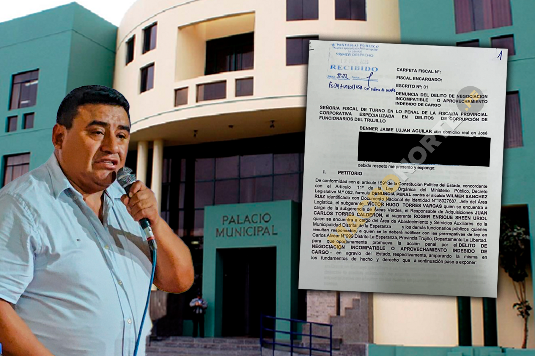 El ex regidor de la Municipalidad Distrital de La Esperanza, Benner Luján Aguilar, denunció ante la Fiscalía Especializada en Delitos de Corrupción de Funcionarios al alcalde Wilmer Sánchez y tres de sus funcionarios, por el delito de negociación incompatible o aprovechamiento indebido del cargo.