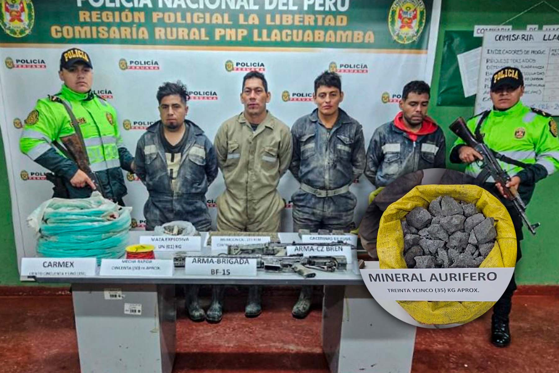Efectivos policiales capturaron a cuatro presuntos mineros ilegales con armas y explosivos en el anexo de Llacuabamba del distrito de Parcoy, en la provincia de Pataz.