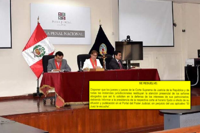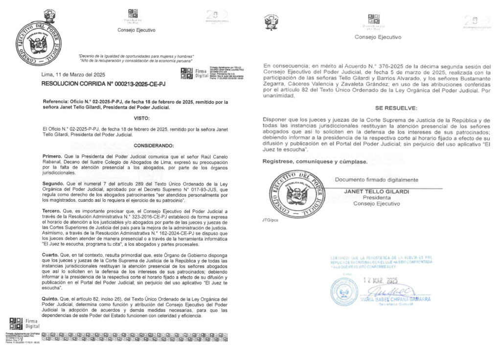 El Consejo Ejecutivo del Poder Judicial, que preside la jueza suprema titular Janet Tello Gilardi, mediante Resolución Corrida N° 000213-2025-CE-PJ, dispuso la restitución de la atención presencial por parte de los jueces y juezas de todo el país, a los abogados que lo soliciten en defensa de los intereses de sus patrocinados.