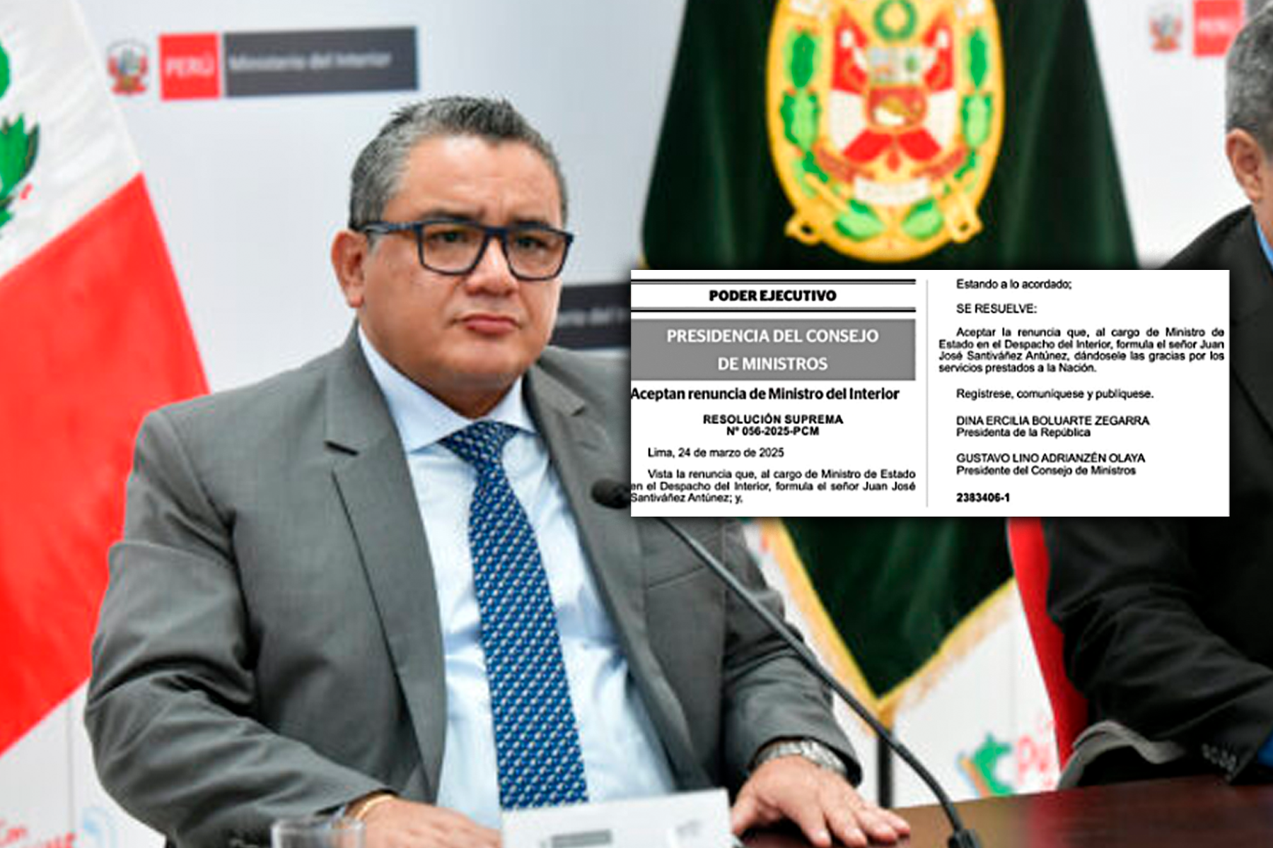 “Se resuelve: aceptar la renuncia que, al cargo de Ministro de Estado en el despacho del Interior, formula el señor Juan José Santiváñez Antúnez, dándosele las gracias por los servicios prestados a la Nación”, se lee en la resolución.