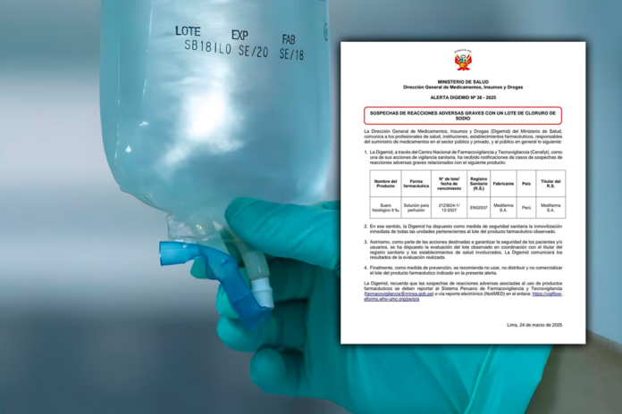 La Dirección General de Medicamentos, Insumos y Drogas (Digemid) ordenó la inmovilización inmediata de un lote de suero fisiológico, elaboradora por Medifarma, luego de que se reportaran reacciones adversas en pacientes de diferentes regiones del Perú.