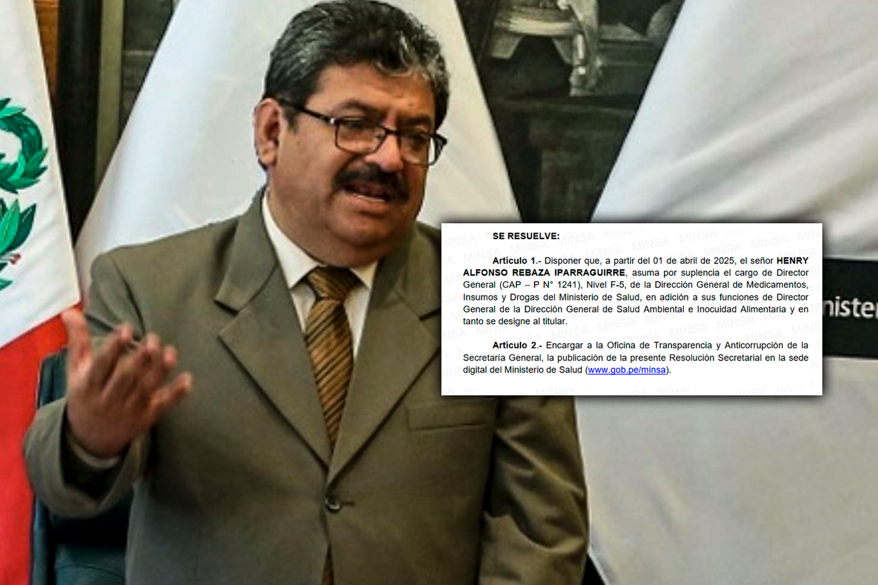 «Que, se ha visto por conveniente disponer que el señor HENRY ALFONSO REBAZA IPARRAGUIRRE asuma temporalmente el cargo de Director General de la Dirección General de Medicamentos, Insumos y Drogas del Ministerio de Salud», se lee en el documento.