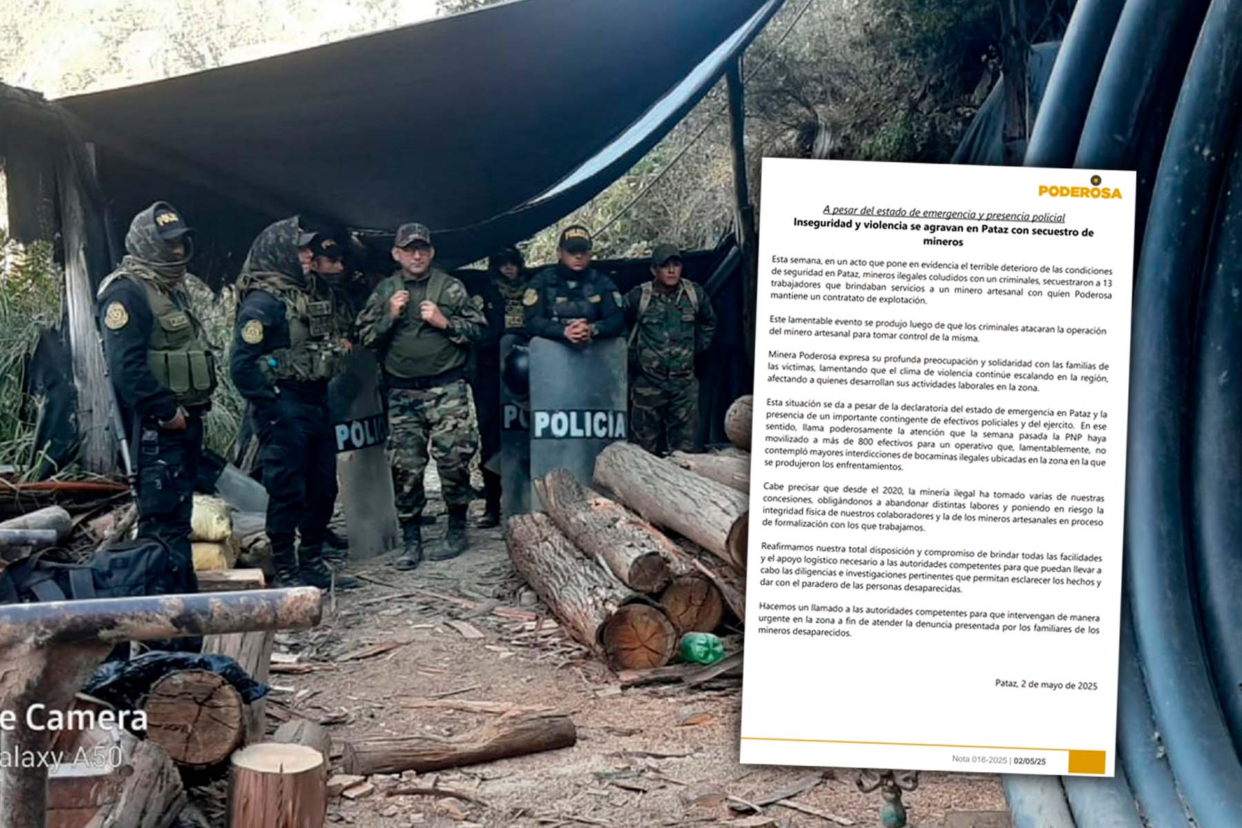 “Esta semana, en un acto que pone en evidencia el terrible deterioro de las condiciones de seguridad en Pataz, mineros ilegales coludidos con un criminal, secuestraron a 13 trabajadores que brindaban servicios a un minero artesanal con quien Poderosa mantiene un contrato de explotación”, expresaron.