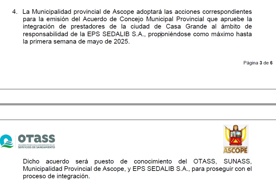 Cabe precisar que la Municipalidad provincial de Ascope se comprometió a gestionar las acciones correspondientes para la emitir el Acuerdo de Concejo Municipal Provincial que apruebe lo solicitado por el municipio de Casa Grande, poniendo como fecha máxima hasta la primera semana de mayo de 2025, sin embargo, actualmente esto no ha ocurrido, lo que genera la demora para la integración de los referidos servicios de agua y alcantarillado para el distrito de Casa Grande.
