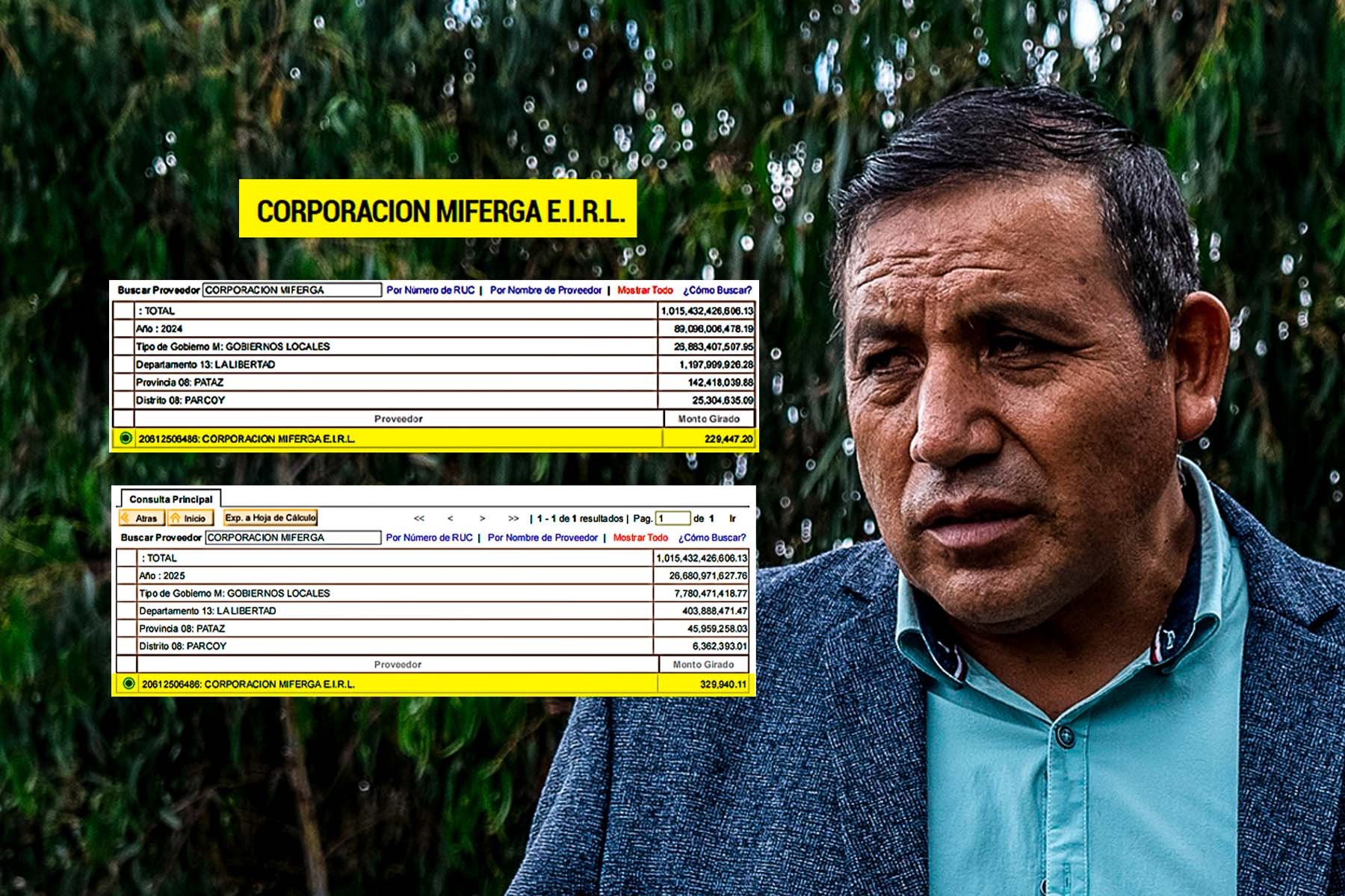 En esa línea, según el portal de Transparencia Económica del Ministerio de Economía y Finanzas (MEF), durante los años 2024 y 2025, la Municipalidad Distrital de Parcoy pagó S/ 229,447.20 y S/ 329,940.11, respectivamente, a la Corporación Miferga.