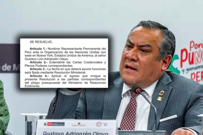 El gobierno de la presidenta Dina Boluarte publicó la resolución suprema con la que se nombra al expremier Gustavo Adrianzén como representante permanente de Perú ante la Organización de las Naciones Unidas (ONU) con sede en Nueva York.