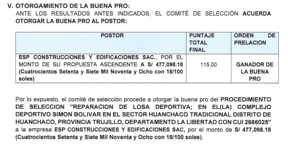 Finalmente, tras la calificación de las ofertas presentadas, EPS Construcciones y Edificaciones obtuvo la buena pro de este proceso de aproximadamente 500 mil soles, logrando su tercer contrato con la gestión de Efraín Bueno en el municipio de Huanchaco.