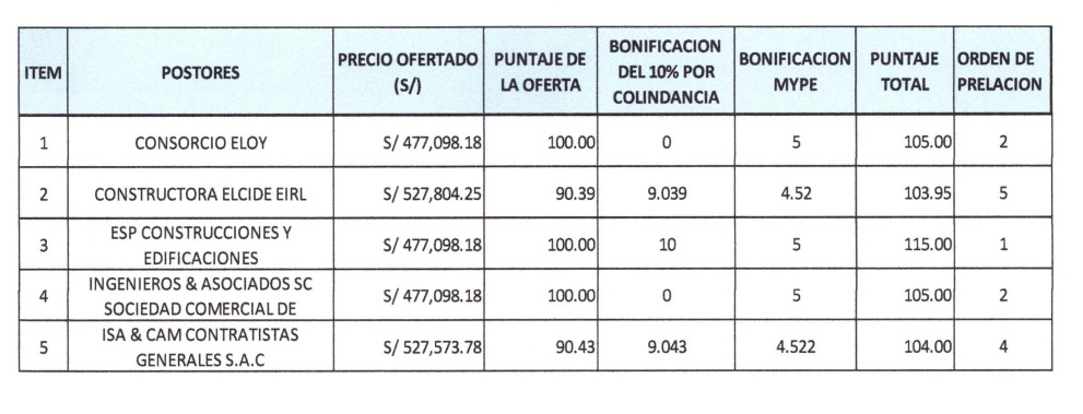Tras la evaluación de las 5 ofertas, se determinó el orden de prelación. ESP Construcciones obtuvo el primer lugar, mientras que Ingenieros & Asociados y Consorcio Eloy compartieron el segundo puesto. Por su parte, Isa & Cam Contratistas se ubicó en el cuarto lugar y Constructora Elcide EIRL obtuvo el quinto puesto.