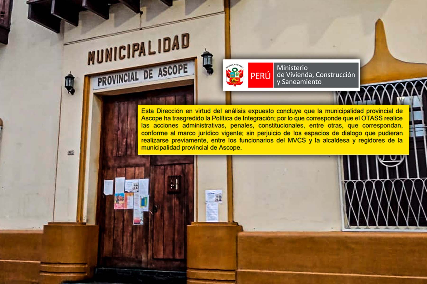 Macronorte.pe accedió al Informe N°476-VIVIENDA/VMCS-DGPRCS-DS, donde el Ministerio de Vivienda dispone que el Organismo Técnico de la Administración de los Servicios de Saneamiento (OTASS) inicie acciones penales, administrativas y constitucionales contra la alcaldesa de Ascope, María del Rosario Cortijo, y 8 regidores, por haber transgredido la Política de Integración Sectorial.