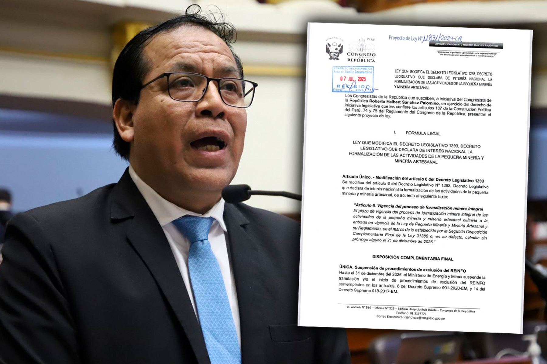 El congresista Roberto Sánchez Palomino presentó un proyecto de ley para ampliar el Registro Integral de Formalización Minera (REINFO) hasta el 31 de diciembre de 2026. La propuesta también busca revertir la exclusión de más de 50 mil mineros informales del padrón, una medida adoptada por el Ejecutivo el pasado 29 de junio.