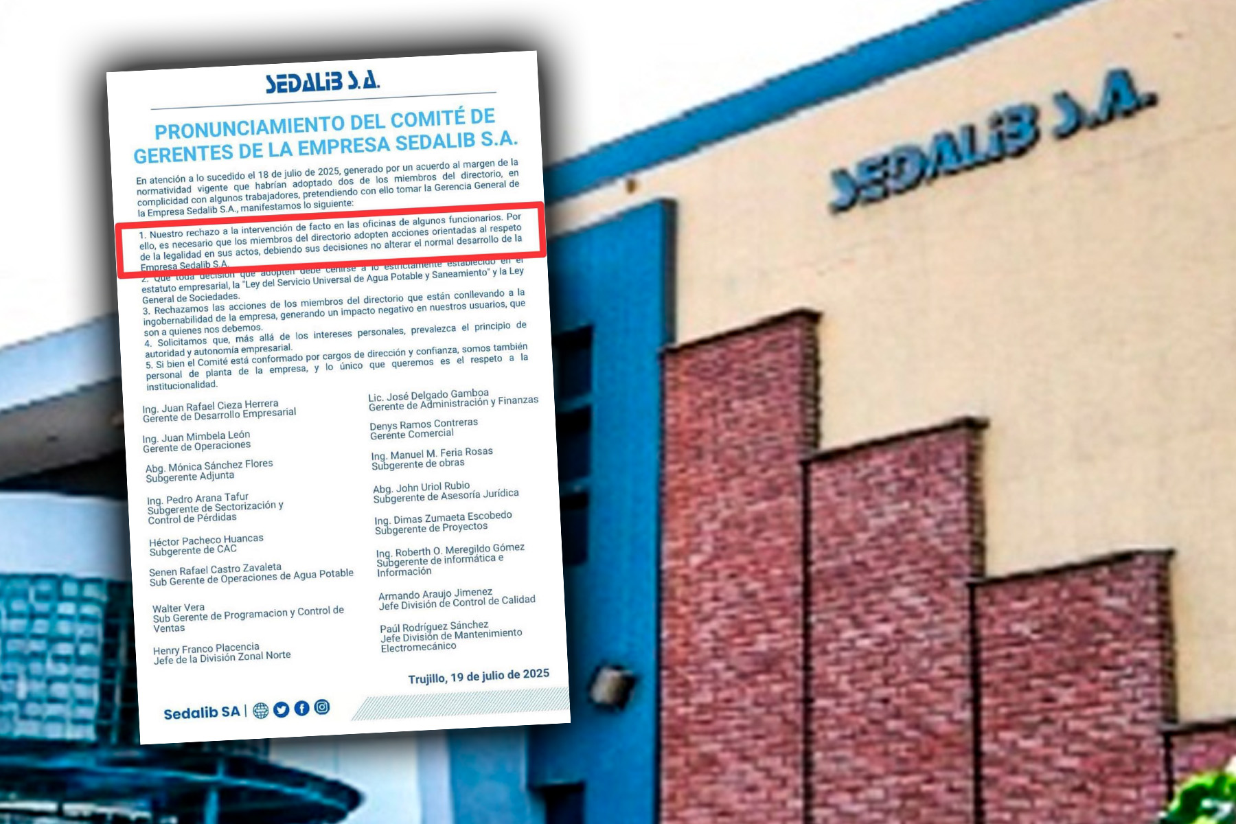 En esa línea, los 16 funcionarios de Sedalib que firmaron el pronunciamiento solicitaron que más allá de los intereses personales, debe prevalecer el principio de autoridad y autonomía empresarial.