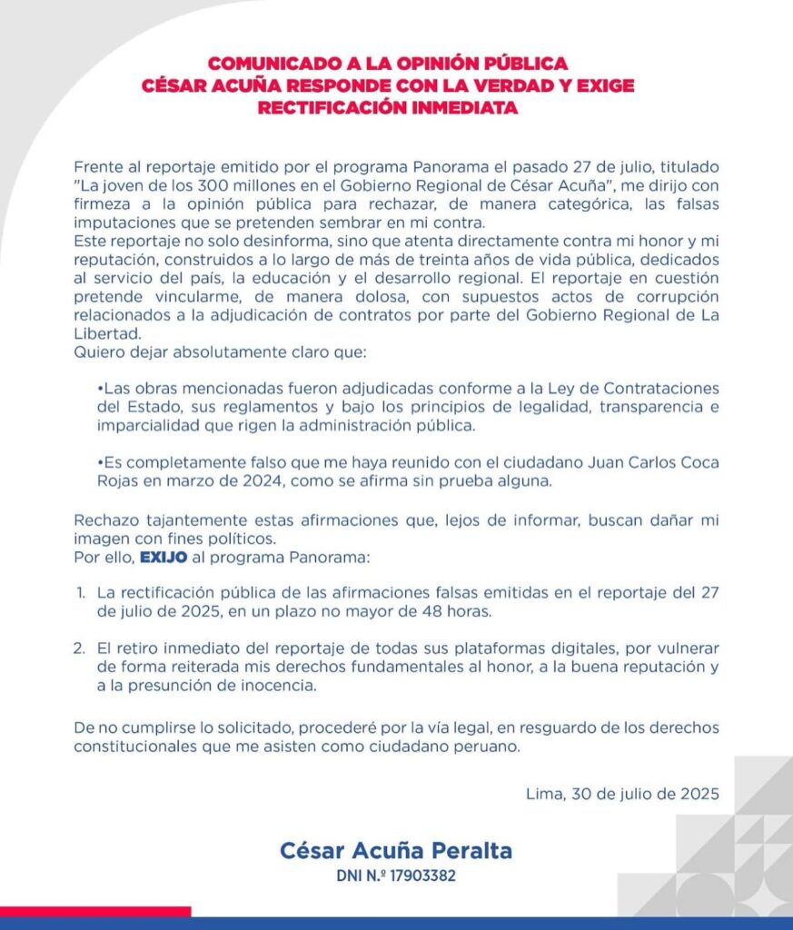 Asimismo, el líder de Alianza para el Progreso aseguró que las citadas obras fueron adjudicadas conforme a ley, por tal motivo, está exigiendo a Panorama la rectificación por lo emitido y el retiro del reportaje periodístico.