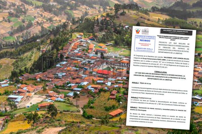 El congresista Waldemar Cerrón, de la bancada de Perú Libre, presentó el proyecto de Ley N° 12019/2025-CR, que propone declarar de necesidad pública e interés nacional la creación del distrito de Chinchupata, en el distrito de Chillia, provincia de Pataz.
