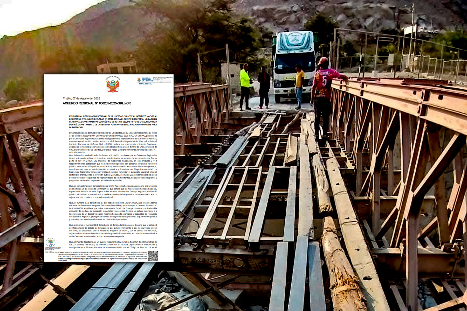 “Exhortar al Gobernador Regional de La Libertad, solicite al Instituto Nacional de Defensa Civil – INDECI declarar en emergencia el Puente Bocatoma, ubicado en la Red Vial Departamental con Código de Ruta LI-123, distrito de Chao, provincia de Virú, departamento de La Libertad, por grave riesgo y peligro inminente para la población. Sus elementos estructurales que conforman la plataforma de la superestructura han colapsado incluido las tablas de madera que iba sobre los durmientes, prácticamente han desaparecido generándose un vacío, es decir un puente sin calzada”, se lee en el documento regional.