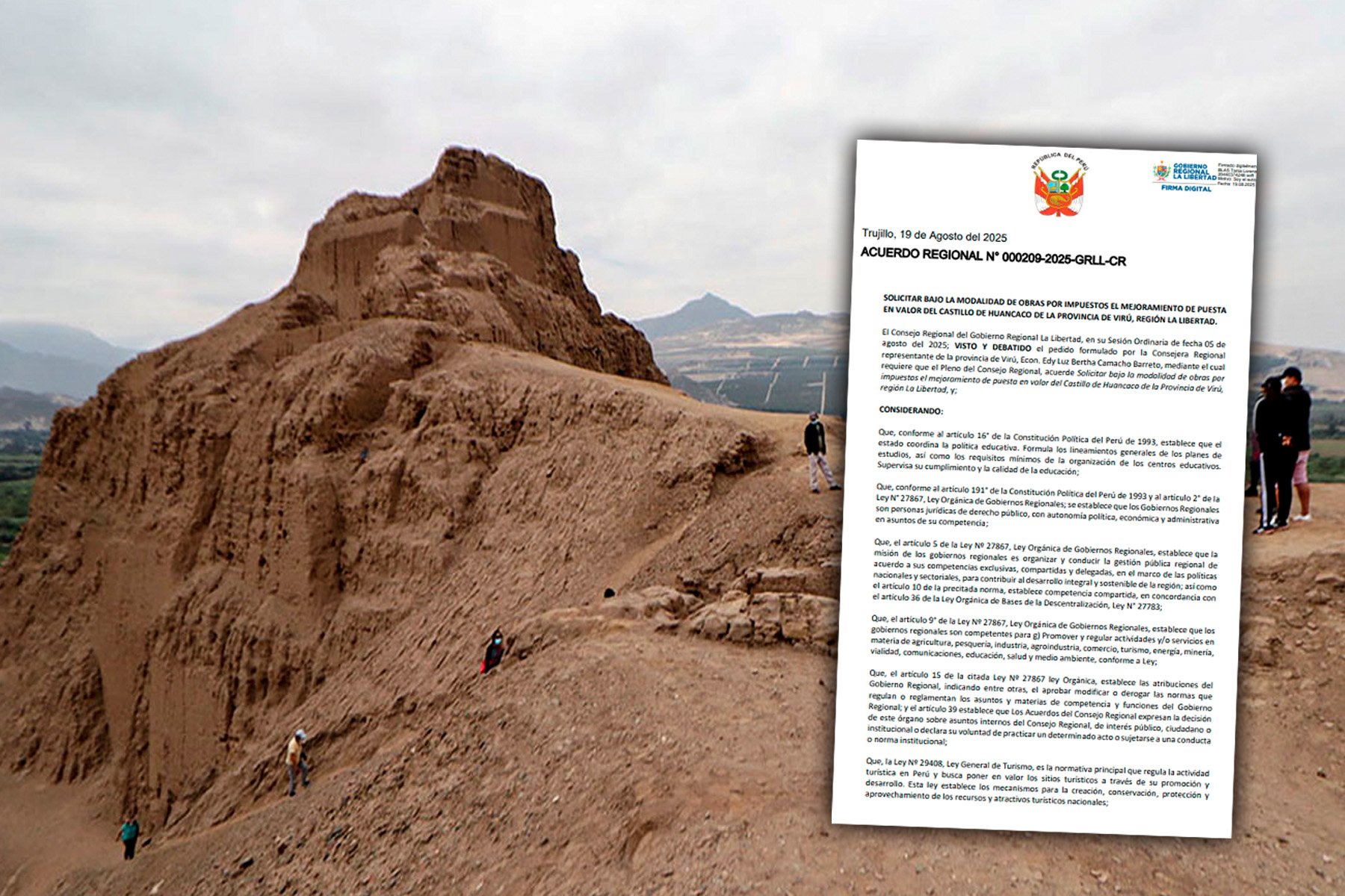 A través del Acuerdo Regional N°0209-2025-GRLL-CR, el Consejo Regional de La Libertad aprobó solicitar bajo la modalidad de Obras por Impuestos, el mejoramiento de puesta en valor del Castillo de Huancaco, de la provincia de Virú.