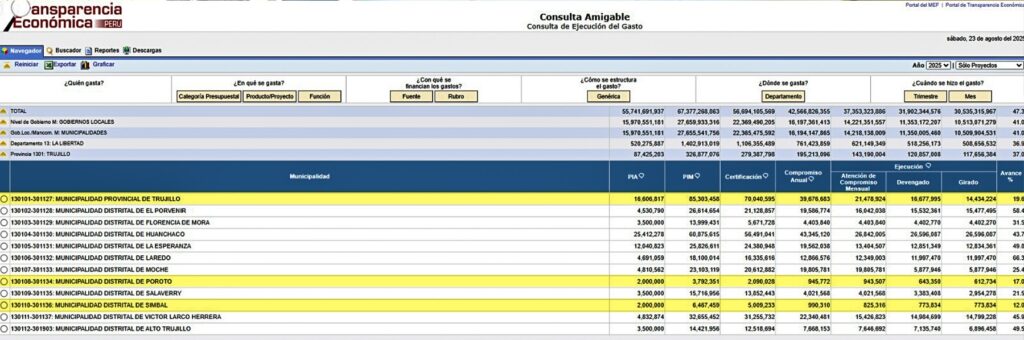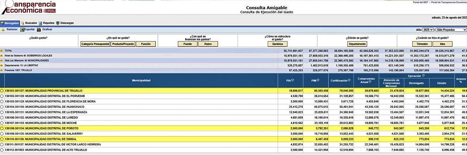 De acuerdo al portal de Consulta Amigable, del Ministerio de Economía y Finanzas (MEF), de las doce municipalidades de la provincia de Trujillo, la comuna provincial de Trujillo, a cargo del alcalde Mario Reyna; el municipio de Simbal, bajo la gestión de Santos Rafael; y la municipalidad de Poroto, liderado por Luis Valle, son las peores en ejecución presupuestal en lo que va del 2025.
