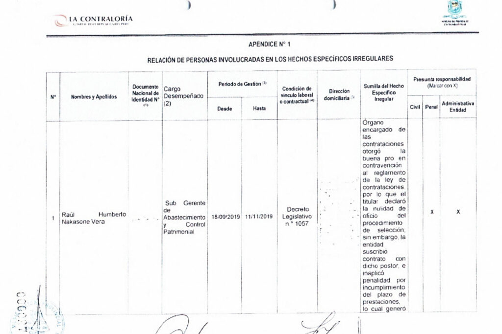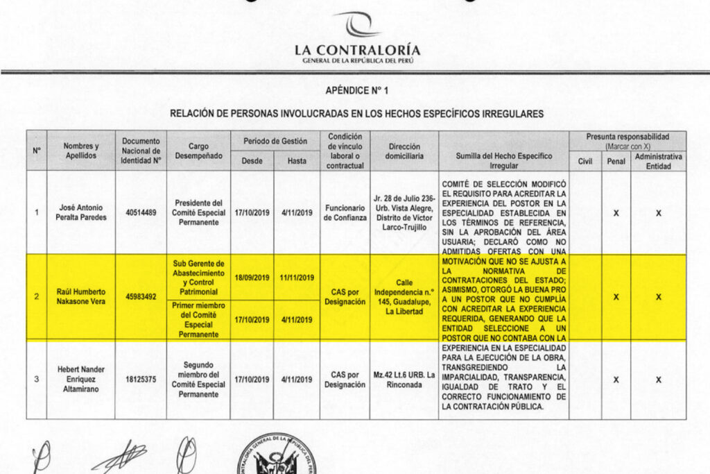Este medio de comunicación digital también ha identificado que Nakasone Vera figura en dos informes de la Contraloría General de la República con responsabilidad penal por presuntos actos irregulares.