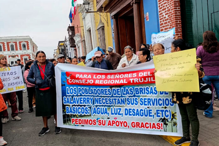 Esta mañana, ciudadanos del sector Brisas de Salaverry protestaron exigiendo al Consejo Regional de La Libertad (CRLL) que apruebe la transferencia de terrenos del Proyecto Especial Chavimochic (Pech) a la Municipalidad Distrital de Salaverry, a fin de que puedan contar con servicios básicos como agua potable, luz y alcantarillado.